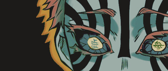 Distinguishing Characteristics: Deathly pale skin, littered with thick blue markings that resemble his tattoos as a human. His nails are also a bright orange, and his eyes give the appearance of shattered glass, with the kanji “upper three” carved into golden hues.
